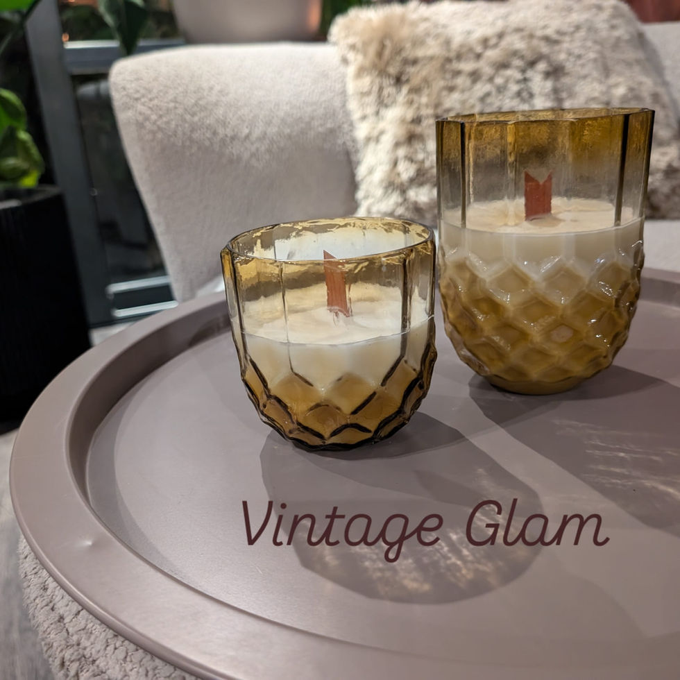Breng een vleugje nostalgische elegantie in huis met de Vintage Glam set: twee glazen windlichten die klassieke charme combineren met moderne luxe. Elk windlicht is afgevuld met een mix van hoogwaardige soja- en kokoswas en voorzien van een houten lont, die zacht knispert en een warm, uitnodigend licht verspreidt. De glazen houder heeft een verfijnd vintage ontwerp dat perfect past in zowel klassieke als eigentijdse interieurs. Deze kaarsenset is ideaal voor sfeervolle avonden, een stijlvol cadeau of als tijdloos decoratiestuk in je huis.